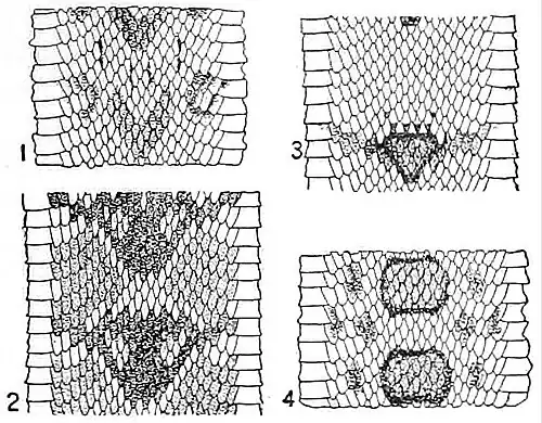 1, Common Eastern banded rattlesnake (Crotalus durissus); 2, Diamond rattlesnake (Crotalus adamanteus); 3, green rattlesnake (Crotalus lepidus); 4, plains rattler (Crotalus confluentus). |