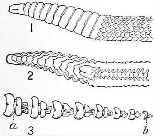 1, Perfect rattle of a large banded rattlesnake; 2, longitudinal section of rattle; 3, separate segments of disjointed perfect rattle of Crotalus (side view): a, basal ‘joint’; b, button. |