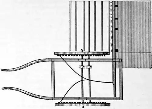 The mower developed simultaneously with the reaper. In fact, many of the earlier machines were designed to be used either as a mower or as a reaper. A separate machine for cutting grass was patented as early as 1812 by Peter Gaillard of Pennsylvania. Hussey's original machine was really a mower, being built on principles afterwards adopted and developed in the construction of mowers. The most prominent name connected with the early development of mowers is that of W. F. Ketchum, who patented in 1847 a mower of simple design, having a single driving wheel. After the adoption of the Hussey type of cutter this machine proved a very successful mower of the rigid bar class. The first patent for a mower of the flexible bar type was granted to Cyrenus Wheeler in 1854. The flexible bar idea was further developed in a machine invented by Jonathan Haines in 1855. This had two drive wheels and a cutter bar jointed to the main frame in such a manner that it could be lifted over obstructions. In 1856 Aultman & Miller patented a machine which contained practically all of the essential features of the successful modern mower, viz. two driving wheels (the best types of modern reapers have one), the flexible cutter bar, with rapidly reciprocating blades, having smooth-edge sections, which was so hinged to the main frame that it could be raised and folded over against the latter when the machine was not in use. While combined reapers and mowers are still made, separate machines for the two purposes are considered preferable. The modern reaper has been adapted to the harvesting of all crops, such as maize, rice, peas, etc., and modified to meet all sorts of conditions, and has enormously decreased the labor involved in harvesting. Consult: Ardrey, American Agricultural Implements (Chicago, 1894); Stephens, The Book of the Farm, vol. ii. (Edinburgh and London, 1871); Scott, Texthook of Farm Engineering (London, 1885); Swift, Who Invented the Reaper? (Chicago, 1895); Stabler, Overlooked Pages of Reaper History (ib., 1897); Official Retrospective Exhibit of the Development of Harvesting Machinery at the Paris Exposition, 1900, United States Department of Agriculture Office of Experiment Stations, Bulletin 103.
