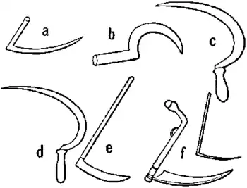 REAPERS, REAPING (from reap, AS. rīpan, to reap; connected with OHG. rīfi, Ger. reif, AS. rīpe, Eng. ripe). The first implement used for reaping was the reaping hook or sickle, dating from the Stone and Bronze ages (Fig. 1, a, b, c, d). Records of this implement are found in Egyptian history B.C. 1400 to 1500. The earliest form of the sickle had a slightly curved blade with straight handle; later the blade was toothed or serrated, and its form approached that of the modern sickle. As a rule the edge was made plain and sharp like a knife. The ancient Jews used a sickle of the Egyptian form. In China and Japan to-day are found sickles of much the same form as those which have been used there from time immemorial. The Greeks and Romans used smooth-bladed sickles or a sickle with toothed blade attached to a curved stick. The latter also used a small hooked knife resembling a pruning hook. The scythe followed the sickle and was apparently introduced by the Romans, by whom it was employed mainly for cutting grass. Pliny, in his writings, distinguishes between the sickle and the scythe, and Crescenzio described both in 1548. At first the scythe was intermediate in construction between the sickle and the modern scythe, as in the Hainault scythe (Fig. 1, f). In time the blade became lighter, and the handle underwent numerous changes in form and material until the modern crooked wooden pattern was evolved. The next step was the fastening of fingers (one to four) to the scythe parallel with the blade, thus evolving the so-called cradle scythe (Fig. 2, a). The fingers were at first made shorter than the blade, and the operator cut toward, and left the cut grain leaning against, the standing grain. The Americans made improvements in these old forms, and developed the American cradle scythe (Fig. 2, b) about the period from 1776 to 1800. This implement was in universal use in America at the beginning of the nineteenth century. It is now employed only where the use of reaping machines is impracticable. Both sickle and scythe are widely useful agricultural implements.