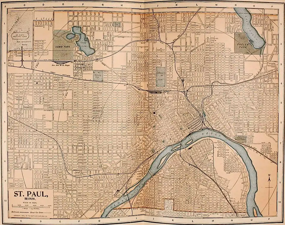 SAINT PAUL. The capital of Minnesota and the county-seat of Ramsey County, situated on the Mississippi, just below Fort Snelling, at the mouth of the Minnesota River (Map: Minnesota, F 6). It is about nine miles below the Falls of Saint Anthony, reckoning from the City Hall, and about seven miles from the celebrated Minnehaha Falls. It is at the foot of the rapids and practically at the head of navigation, about 2300 miles from the mouth of the Mississippi. This point was naturally a trade centre in pioneer days. It tapped the great fur-bearing region through the Minnesota River, thus becoming an important station of the Hudson's Bay Company, and it was a natural depot for supplies brought up by river boats, and for produce taken back. This river traffic gave Saint Paul its first impetus as a centre of trade and transportation, just as the water-power of the falls a little farther up stream made Minneapolis preëminently a manufacturing point.