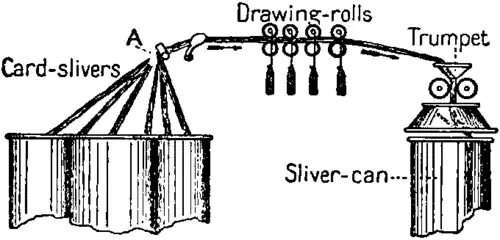 In the spinning jenny a number of large reels of fibre formed into a thickish coil, called a roving, were set on upright fixed spindles, and the ends of the rovings were passed between two small movable bars of wood placed horizontally and under the control of the spinner, who could thus make them press more or less on the roving, and consequently increase or decrease the draw upon it from the spinning spindles, which were set in a row at the other end of the frame, and all capable of being set in motion simultaneously by the wheel. The spinner drew out the rovings by moving the bars back and forth and at the same time turned the crank with his right hand to rotate the spindles.