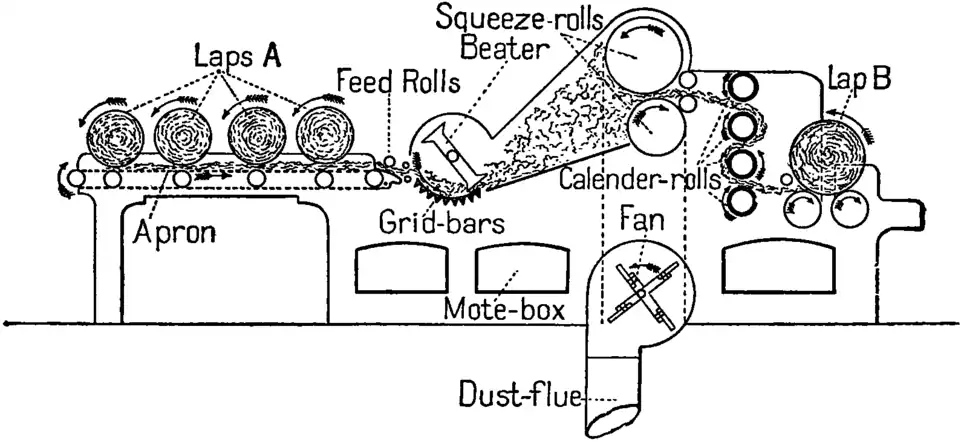 The opener or breaker lapper is a similar machine to the intermediate or finisher lappers, as shown in Fig. 1, and described below. In the breaker lapper the cotton as taken from the bale is fed to it in a hopper or by some kind of automatic feed, and delivered in laps which are then placed on the intermediate lapper, either 3 or 4 laps being ‘doubled’ on the same and the cotton after being loosened and further cleaned is delivered in laps to be placed on the finisher lapper, 3 or 4 laps from the intermediate being again ‘doubled’ and delivered in a single lap ready for the card. The function of the lappers is to thoroughly loosen the lumps of cotton as taken from the bale, to remove dirt and dust and as much leaf, trash, and motes as possible. There are usually three of these, the breaker, intermediate, and finisher lapper. Fig. 1 is a section of an intermediate or finisher lapper. The cotton enters these machines in a sheet made up from the laps, A, delivered onto the slowly moving apron, from which it is taken by the feed-rolls and delivered to the rapidly revolving beater, which forces it against the grid-bars, loosening the dirt and motes which fall through the grids into the mote-box. The cotton is left in a light and feathery mass which is drawn between the squeeze-rolls by the suction of the fan, which also draws the dust and fine dirt from the beaten mass and discharges them through the dust-flue. The sheet of cotton from the squeeze-rolls is taken by the calender-rolls, and compressed and finally rolled into the lap B. The lap is about one inch in thickness, 40 inches to 48 inches wide, and usually from 48 to 52 yards long.