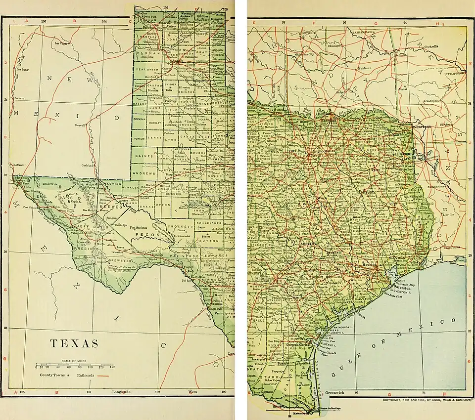 TEX′AS. A South Central State of the United States, popularly called the ‘Lone Star State.’ It is, next to Florida, the southernmost State of the Union, lying between latitudes 25° 51′ and 36° 30′ N., and between longitudes 93° 27′ and 106° 43′ W. It is bounded on the north by Oklahoma and Indian Territory, on the east by Arkansas and Louisiana, on the southeast by the Gulf of Mexico, on the southwest by Mexico, from which it is separated by the Rio Grande, and on the northwest by New Mexico. It is of an irregular triangular shape with the apex pointing south and a square ‘panhandle’ extending northward. Its greatest length from north to south is about 800 miles, and its greatest breadth about 750 miles. It is the largest State in the Union, having an area of 265,780 square miles, of which 3490 square miles constitute water surface. Its area is larger than the combined area of the Atlantic States from Maine to Virginia, inclusive, and nearly one-third greater than that of the whole German Empire.