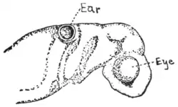 Ear, the organ of hearing, especially adapted to receive sound-vibrations from the air. The ear is merely the receiver; it must of course be connected with the brain by the nerve, otherwise there is no hearing. The parts of the ear are thrown into vibration by the sound-waves, and these vibrations are conveyed by the nerves to the brain. If the nerves are destroyed and all the other parts left perfect and uninjured, there, nevertheless, is no hearing. Receiving organs of this kind are placed on the surface in order that they may be in contact with the external world. They are called end-organs or sense-organs. The ear is one, the organs of sight, smell, taste and touch are others. Ears are found very low in the scale of animal life. In the simpler forms they consist of little bags filled with fluid, in which are small, hard particles called ear-sand or ear-stones. The shaking of the bag causes the fluid to vibrate, and the ear-sand is also put in motion, which increases the effect upon the nerves of hearing. In all the vertebrated animals the ear, in common with the other sense-organs, begins on the surface as a patch of the outer cell-layer. There are two round patches on each side of the head, which become sunk in like small saucers (see illustration). The ear starts in this way in all fishes, amphibia, reptiles, birds and mammals. In this stage it is called the ear-saucer or ear-pit. Soon it begins to close by the growth of the skin over it; it becomes a sort of pocket, at first open and then closed, after which it is called the ear-vesicle. From this ear-vesicle, which is little more than a sac, arise gradually all the other parts of the inner ear. In the higher animals three parts are recognized: an outer, a middle and an inner ear. The outer ear includes the part that can be seen and the tube leading inward from the surface. Ear-wax is formed within the tube, and a membrane is stretched across its inner end, called the tympanic membrane. The middle ear is a space filled with air, bounded by the membrane on the outside and the bony wall of the internal ear on the inside. The space is crossed by a chain of three small bones, called the hammer, the anvil and the stirrup. The hammer is fastened to the tympanic membrane, and the stapes to a small oval membrane which covers one of the small openings through the bone into the bony cavity that contains the inner ear. The cavity of the middle ear also communicates with the throat through a passage called the Eustachian tube.
