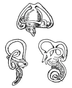 In reptiles and birds there is a single long bone in the middle ear, instead of three bones as in the higher animals. The inner ear is the essential part, in fishes the only part. The middle ear is gradually developed and the external ear added to it as we go up the scale of animal-life above the fishes. The inner ear consists of an upper portion from which three semicircular canals arise, and an inner part which in the higher animals is coiled like a snail-shell and called the cochlea; but this part is fully developed only in mammals (see illustration). The illustration shows the inner ear of a reptile, a bird and an ox. Notice that in the reptile there is no cochlea, only a small projection in place of it; in the bird this projection is longer and curved; and in the ox it has become long and coiled like a snail-shell — the true cochlea. The semicircular canals are present in all three. It is in the cochlea that the most complicated structures are found. The principal branch of the ear-nerve enters here, and becomes connected with certain large cells provided with hairs that vibrate when sound-waves reach them. The whole is inclosed in very hard bone, so that there are a bony part and a membranous part to the internal ear. The membranous part consists of closed sacs full of fluid, and these are also surrounded by a fluid. Thus the arrangement is exactly suited to receive vibrations and transmit them to the ear-nerves. In the cochlea are many little organs, standing side by side on a membrane and forming an arch or tunnel by arching toward each other. These are the organs of Corti. They vary in size, and possibly respond to different sets of sound-vibrations; but, on the other hand, it is possible that they simply act as dampers, somewhat like those in a piano, to prevent the too long vibration of the parts of the membrane upon which they rest. For fuller descriptions of the ear see text-books on anatomy and physiology. See, also, Sound.