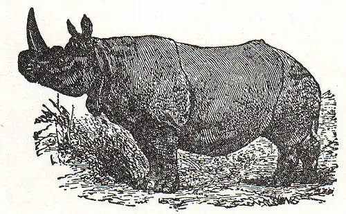 Rhinoceros (rī́-nṓs′ḗ-rŏs), a thick-skinned animal with a horned snout, confined to tropical Africa and Asia. There are two species in Africa and three in Asia. The African species embrace a two-horned and a one-horned variety. The latter is the wide-mouthed rhinoceros, sometimes called white, although its skin is of a slaty color. It is the largest of the family, a full-grown male, according to Selous the celebrated hunter, standing six and one half feet high at the shoulders. The largest of the Asiatic species also has a single horn. It is ten feet long and five feet high at the shoulders. There are enormous folds in the skin which appear like huge plates of armor. Another form, inhabiting Sumatra, has two horns on the snout. The horn is a powerful weapon. Besides being used in attack, it is strong enough to root up small trees, which the animal sometimes does, for the sake of the fruit and foliage. They are shot with iron and tin bullets, as the hide is so tough that leaden bullets will not penetrate it.
