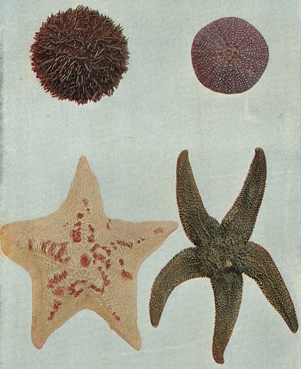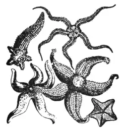 Star′fish, the name for a number of marine animals having arms or rays arranged around a central disk. As these are symmetrically arranged, the animal is said to have radial symmetry. There are several varieties, but the common five-rayed starfish is the type. It is reddish, or yellow, in color, and those along the New England coast commonly vary from one inch to one foot in diameter. It lives on the sea bottom and crawls sluggishly by means of tube feet. It is often seen in shallow pools left by the retreating tide. The skin is stiffened with plates and nodules of lime. The mouth is in the center of the disk, on the under side, and the animals feed on decaying fish and other animal matter, as well as on small shelled mollusks. Their means of locomotion is peculiar. There are four rows of tube-feet in furrows along the lower sides of the arms. These tube-feet are filled with water and connected with a system of water tubes running through the body. On the back of every starfish may be seen a little rounded knob, which is porous and leads into the water-vascular system. From this tubercle, a tube leads downward to join a circular canal surrounding the mouth, and from this central canal a tube extends into each arm or ray. These latter canals are connected with the tube-feet and also with internal pockets, one for each tube-foot. The nervous system consists of a ring about the mouth and a nerve running from it into each arm. At the extremity of each arm is found a little red eye-spot which is sensitive to light. Some other starfish have 11 to 13 rays, and some resemble five-sided pin cushions in form. The brittle starfishes have a central disk, with long, slim, muscular rays by means of which they move. Their tube-feet are not developed. All starfishes possess the power of restoring, or regenerating, lost or injured parts. See Echinodermata and Sea-Urchin. Consult Romanes’ Jelly-fish, Starfish and Sea-Urchin.