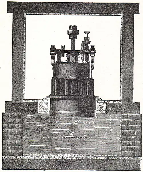 , a wheel so arranged as to transform water-power into rotary mechanical power. The work done is due to the force of gravity on the water, and the possible work is equal to the fall multiplied by the weight of the water. To get the maximum work it is necessary that the water shall enter without shock and leave the wheel without further fall and velocity, conditions which of course, can only be approximated. But water-wheels give efficiencies which rival that of other prime motors Efficiencies of over 90 per cent. have been reached, while efficiencies of 75 to 85 per cent, are commonly attained In the best wheels. Water-wheels have been used from a very remote period in human history. Up to about 1825 practically all wheels used were of three types: overshot, undershot and breast wheels. These were wheels revolving on horizontal axes. They had buckets or paddles on the circumference. As the name implies, the water fell from above into the buckets of the overshot wheel, while in the case of the breast wheel the height of the water was about that of the axis of the wheel, and in the undershot wheel the water flowed below and moved the wheel by impact against the blades. The overshot and breast wheels commonly reached efficiencies of from 75 to 80 per cent., while the efficiency of the undershot wheel was much less. The above-named wheels are seldom used now, except in small powers and in old mills. The two kinds of wheels used to-day are turbine-wheels and impact wheels of the Pelton type. The turbine wheel was introduced into France by Fourneyron about 1827, and from there soon afterwards into England and the United States by Fairbain and by Boyden. The peculiarity of the turbine is that the water flows between curved channels, so that it impinges on the vanes or buckets of the turbine tangentially, and thus by force of reaction rotates the turbine. The vanes of a turbine are commonly warped surfaces, shaped for local conditions and according to the special ideas and experience of the designer. The older turbines revolved about a vertical axis, but many modern turbines have horizontal axes.