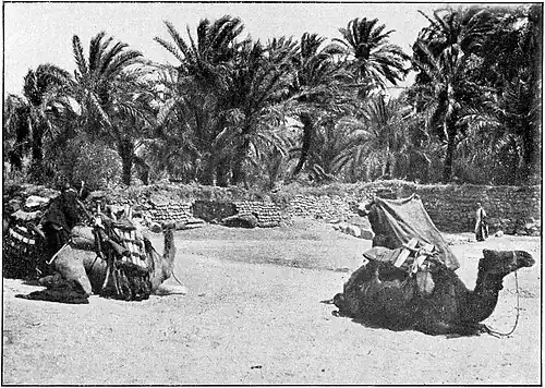 In the oasis of Ḳijâl dwells the al-Farâḥîn clan of the Mesâʻîd tribe. This clan numbers about sixty families who live in tents or huts made of palm leaves. They cultivate date palms, pomegranates, and various vegetables.[5]