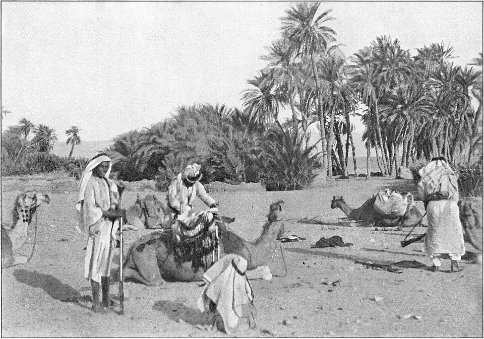 While we were packing up our baggage, Sâlem, our companion, told me that he could not accompany me to the chief Abu Ṭḳêḳa, as one of his relatives had killed a subject of Abu Ṭḳêḳa, who attended to a palm garden in the oasis of Šarma; but he added that he had found another guide for me. This proved to be a man of about sixty, who had a very marked squint. Mḥammad spat when he first saw the new guide and called upon Allâh to us from bad omens and from the misfortune which is brought by every person who squints.