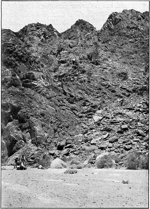 Accompanied by the guide and Tûmân, I climbed up to the black peak, beneath which we sat down. The ascent required more than half an hour and was dangerous in places, as we had to crawl on our stomachs up the smooth slope. We named this peak Samra’ Tûmân (Fig. 34), and the guide promised to see to it that the Bedouins should call it by the same name.