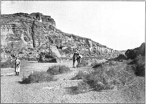 Fig. 35—From Ḳaʻedân Râbeṛ looking northeast. At 4.12 we reached the defile of Ḳaʻedân Râbeṛ at the point where the escarpment of Ṣafra’-l-Bedʻ swings off somewhat to the southeast (Figs. 35, 36). The channel of al-Abjaẓ penetrates through the bend thus formed, thereby cutting the defile. The river bed, scarcely twenty meters broad and covered with a growth of dark green ṭarfa trees, is bordered on the right and left by walls more than fifty meters high, formed of horizontal, yellow, red, and blue strata. The rays of the sun were reflected from the southeastern wall, and there quivered a rainbow spectrum around the separate strips of color. Seen from the south, the defile produces an even more overwhelming impression. The southern façade resembles a gigantic fortress with olive-blue foundations, violet walls, and a high, slender, yellow, rectangular tower sharply cut with battlements and numerous round loopholes. Behind this fortress, far on the northeastern horizon, rises the purple mountain range of Lowz and to the south of it the half white and half black mountains of al-Maḳla and ar-Râḥa; while in front of the latter, nearer the valley, are the lower hills known as al-Ḥemâra and al-Kbejda, the colors of which range from grayish-green to orange-yellow. In the river bed numerous half buried sejâl trunks were visible.