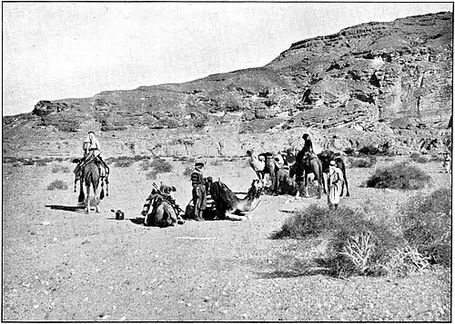 At 6.38 we rode through the šeʻîb of al-Maḳje and approached the black mountain of al-Ḫšêrme. To the southeast we saw the mountain of Zihed, which resembles a kneeling camel. Its isolated peak rises above the entrance to the šeʻîb of al-Ḫrob.