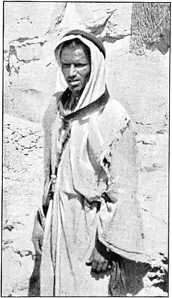 Fig. 33—Our guide Farrâǧ. but these hostile bands have suffered more than one defeat there. In the spring of 1907 the Ḥwêṭât at-Tihama—who owe allegiance to the head chief Abu Ṭḳêḳa—made a raid against the ʻImrân who were encamping by the šeʻîb of al-Ktejf. The latter, being forewarned of the approaching danger, carried a great number of stones to the edge of the slope Keṯîb al-Mbassi and hid behind them. When the last man of the enemy passed along the footpath about five hundred meters long advancing from the south to its northern extremity, the ʻImrân began to roll large and small stones down on both ends of the path, in this way killing six of the enemy and compelling all the rest—over two hundred in all—to beg for mercy. At the southern end of this footpath is the spring of Ḥḳejl, near which there are four groups of palm trees.