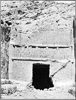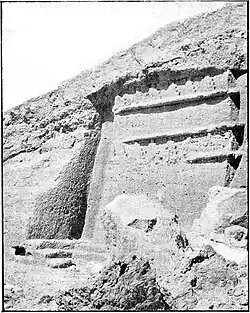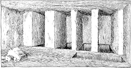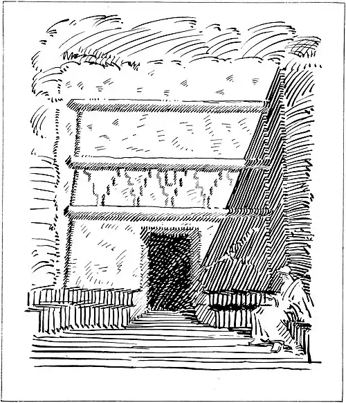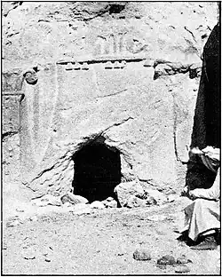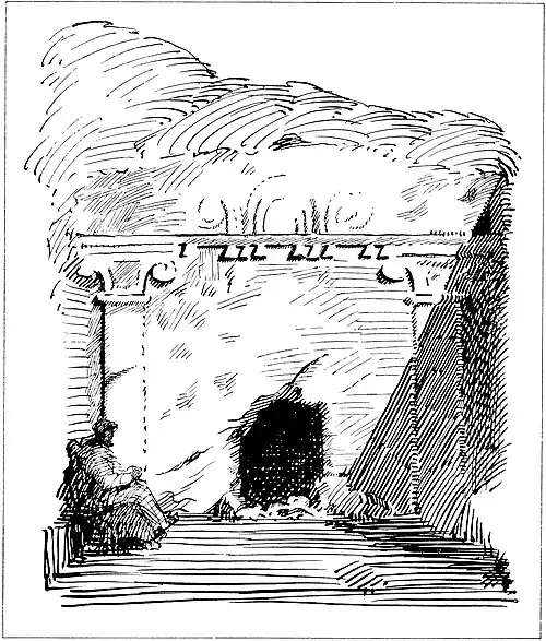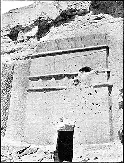 Fig. 43—A sepulcher, Madian. and aš-Šedîḫ; on the west by aš-Šiḳḥ, ʻAǧʻûǧe al-Ḳṣâra, and ʻAbdejn; and on the southwest by al-Ḥamra and aṭ-Ṭlâḥ. To the north of al-Mṣalla extends the white plain of al-Brejṯem; and to the southwest, al-Ḥamẓa, in which is situated the well of the same name. The rain water flows from both these plains through the šeʻîb of Maḳna to the grove of date palms bearing the same name situated on the shore.