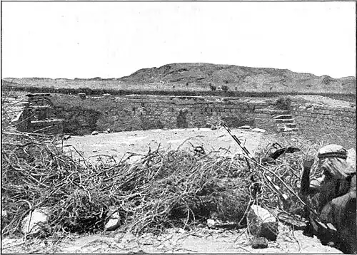 Fig. 30—By the well of Ajla. sea, and a small watchtower (Fig. 31)—called al-Brejǧ—has been set up to prevent the Bedouins from occupying the rocks surrounding the saddle path and thus intercepting the pilgrims on their journey. This steep path, artificially cut out from the rock, was originally called ʻAḳabat Ajla, and from it the present settlement and stronghold of al-ʻAḳaba has received its name.