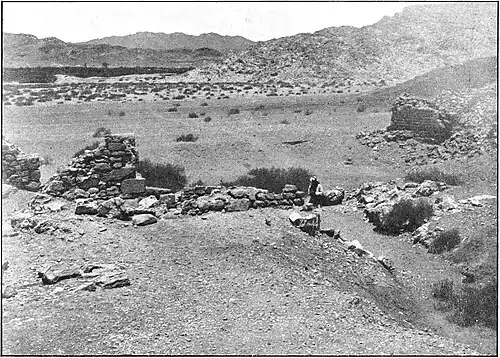 At eleven o’clock we rode off in a southeasterly direction past the ruins of Ḥawra, crossed the stream of al-ʻEfâl, and at 11.26 halted by the ruins of al-Mâlḥa (Figs. 53, 54). This was a pilgrimage station established after the sixteenth century. Northeast of al-Mâlḥa appear the ruins of an old building—the watchtower al-Birǧ, with a well. After halting for twenty minutes, we turned off towards the south and at 11.55 came upon the large, quadrangular, ruined fortress of al-Malḳaṭa, situated at the southern edge of the oasis. Here the broad ramparts and deep trenches are still clearly visible, surrounding great piles made up of ruins of old buildings that have fallen to decay. Some of the walls can be traced for a distance of one hundred paces. Only a strip of soft