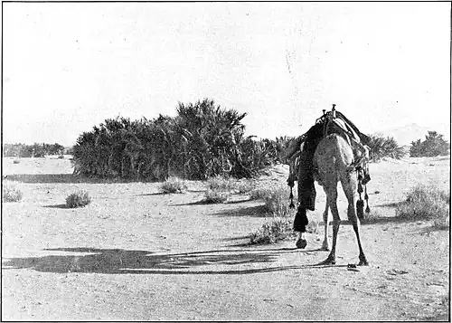 At 10.28 A. M. our camels knelt down beneath the palms at al-Ḫrajbe (Fig. 56) (temperature: 35° C). As there was no pasture anywhere in the neighborhood, we tied their forelegs together, and instead of grazing they rested. Before long six traders approached us. They were young men with thick lips and broad, fleshy noses; and all of them were dressed in thin white shirts and fine white turbans. They were eager to know what we were buying or selling. Behind them came two other men: one dressed in trousers, one leg of which reached only to the knee, and in a vest, while the second was wearing trousers similar to our bathing drawers and a thick padded coat.