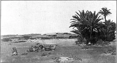 At 9.42 we saw to the southeast the green palm groves in the oasis of ʻAjnûna, which belongs to the Ḏijâbîn and Zamâhre clans of the Ḥwêṭât at-Tihama. It is situated at the foot of the red hillock range of Berḳ al-Mḫaṣṣab at the point where the latter is penetrated by the Râwa šeʻîb. Beneath the trees could be seen a number of white huts constructed of palm leaves.[1]