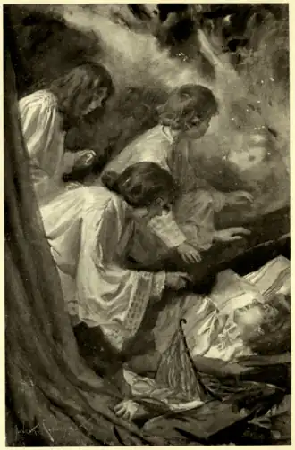 Lucy lay in her mother's lap suffering from an ugly gash across her forehead. Gordon had bathed her forehead as soon as he had discovered it, and carried her to the cabin, with her soft arms clinging around his neck.