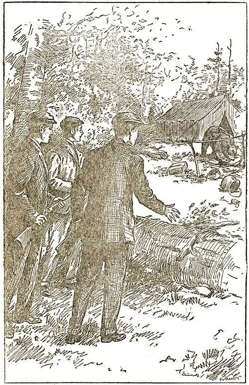 "I thought I had a glimpse of something moving over there back of the tent, and it might be Bluff. I hope he don't try to shoo the old varmint off before we get a whack at him. I've only got bird-shot in my gun but at dose quarters that ought to do as well as a bullet, eh, Frank?" asked Jerry, excited at the prospect.
