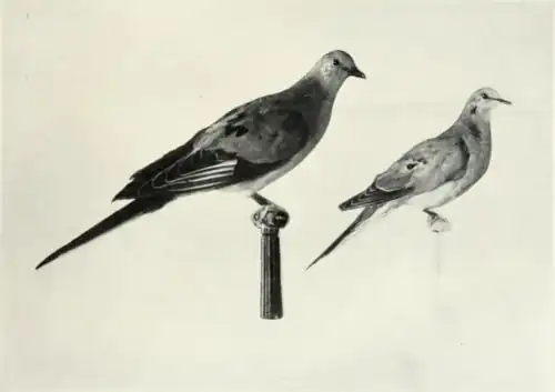 Dear Sir:—I have been away for the past three weeks and find your letter of June 27 here on my return. The photographs sent you were those of the Passenger Pigeon and the Carolina dove, the one of the two birds being intended to show relative size and appearance. It was taken from two of the best specimens in the museum, placed at exactly the same distance from the camera so that the picture shows the comparative size exactly. The birds being so similar in general appearance, the smaller one looks as if it were further away than the larger, and this, I think, shows clearly how impossible it is for the ordinary observer to discriminate between these two species when seen separately in the field. Of course a mixed flock would be a different proposition, but so far as I know the two species never mingle, and, at least in this State, it is an unusual thing to find the Carolina dove in large compact flocks such as are characteristic of the Passenger Pigeon. In several cases, however, during August and September I have seen large scattered flocks of the Carolina dove which were feeding on weed seeds and grain in open fields, and which when disturbed, gathered into small bands of twenty to fifty each and flew and perched very much like Passenger Pigeons. In one case I saw at least five hundred Carolina doves acting this way, and had hard work to convince a sportsman friend of mine that they were not Passenger Pigeons. Finally, after getting directly under a small tree on which a dozen or more were perched, he was able to see that characteristic black dot on the side of the neck, and was also able to estimate more correctly the actual size of the birds.