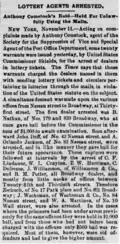 New York City, New York; November 11, 1879. Acting on complaints made by Anthony Comstock, agent of the Society for the Suppression of Vice and Special Agent of the Post Office Department, some twenty warrants were issued yesterday, by United States Commissioner Shields, for the arrest of dealers in lottery tickets. The Times says that these warrants charged the dealers named in them with sending lottery tickets and circulars pertaining to lotteries through the mails, in violation of the United States statute on the subject. A simultaneous descent was made upon the various office, from Nassau street to Broadway, at Thirty-first street. The first dealer arrested was B. Nathan, of Nos. 179 and 830 Broadway, who at once gave bail before the Commissioner in the sum of $1,000 to await examination. Soon afterward John Duff of No. 49 Nassau street, and A. Orlando Jackson, of No. 92 Nassau street, were arrested, and in like manner they gave bail for their future appearance. These captures were followed at intervals by the arrest of C. F. Lindauer, W. L. Crayton, E. W. Harriman, C. Defreese, J. Williamson of Williamson & Co., and R. N. Potter, all Broadway dealers, and mostly from little nooks of offices between Twenty-fifth and Thirtieth street. Theodore Zschoch, of No. 17 Park place and No. 861 Broadway; J. Wachsman, of Wachsman & Co., No. 84 Nassau street, and W. A. Martine, of No. 10 Wall street, were also arrested. In the cases where the prisoners had been under arrest previously for the same offense they were held in $1,000 bail, and from these who had not before been charged with the offense only $500 bail was required. Most of them, however, were old offenders and had to give the higher amount.