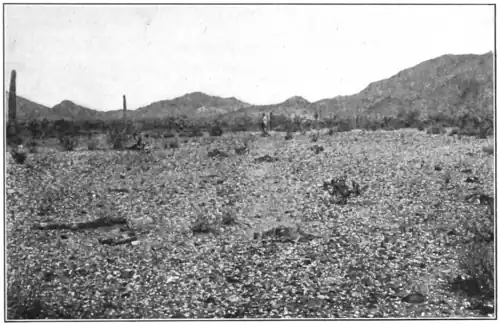 Such places were formerly respected by the tribe, but they are now robbed with impunity to get "relics" to sell. A man at Pe-eʼpûtciltkʼ informed the author's interpreter, José Lewis, of the location of one of these caches in the low hills south of Casa Blanca. We found that a number of concretions, crystals, shells, a bird carved from stone, and a war club had been deposited in an olla with a bowl turned over it, rendering it water-tight. The whole had been hidden under a heap of stones at the summit of a spur of the hill about 4 miles from the villages.