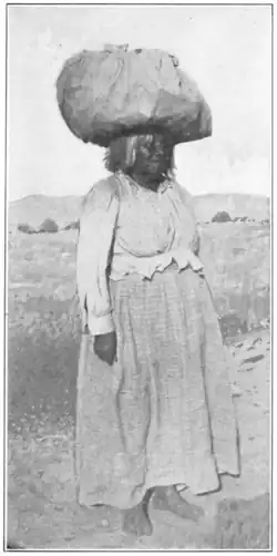 The work of clearing the fields, planting, and irrigating devolved upon the men. The women harvested the crops, carrying the products in their kiâhâs. The men thrashed the wheat—with horses after those animals were introduced. Prior to that time, and even now when the crop is small, the women beat out the grain with straight sticks. As it was thrashed, the women winnowed it in baskets and piled it on a cotton cloth, the corners of which were tied together, forming a sort of sack that was thrown upon a horse and taken by the men