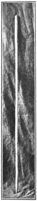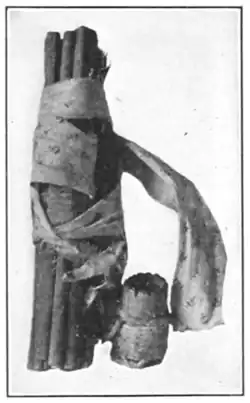 The third bundle contains two sets of 4 sticks each, which were originally painted blue. They are sharpened to tapering points at one end. To each stick is tied two of the tail feathers of some small bird (pl. XIV, a).[45]