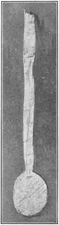 Ladle. Ladles are said to be of recent introduction, the Pimas having obtained them from the Papagos, who in turn had derived the art of making them from the Mexicans. They are commonly made of mesquite, though the Papagos make them of paloverde wood. The bowls are not rounded, but are made in the shape of a flattened cone,