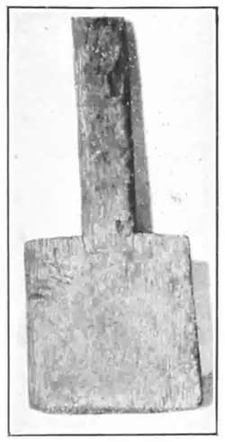 Pottery paddle. A paddle of cottonwood is used to shape the outer surface of pottery. It is hollowed to fit the convex surface of the vessel, and is now frequently made from a barrel stave, which has the proper curvature. The paddles are of varying sizes, according to the sizes of the vessels on which they are used, but the handles are always proportionately short.[20]