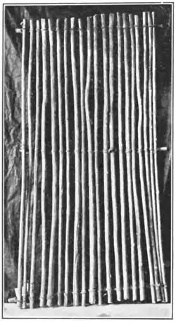 21. The door (fig. 16, b) is 1 m. long and 0.850 m. wide. The rods are from 1 to 2 centimeters in diameter and are held by 5 hide strands, 2 at each end and 1 in the middle. The stiffening of the rawhide has warped the upper portion.
