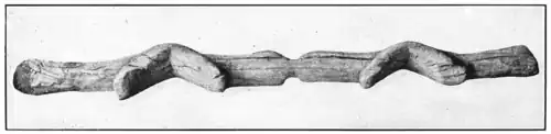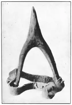Yoke. With the introduction of cattle the Pimas obtained their first draft animal. They were used principally in plowing and were fitted with yokes (fig. 12) of cottonwood or willow which were attached to the horns of the animals as in southern Europe to the present day. The yokes themselves are the best evidence that the burden upon the animals was light, for these small sticks of brittle wood would snap at the first strain if on the shoulders of an ox team with a heavy load. There are a few yokes yet to be found, though they have not been used for several years. The specimens collected are fairly well made, straight, but with sections hollowed to fit the necks of the team.[14]
