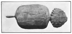 Pestle. For pounding up mesquite beans in the mortar a large wooden pestle is sometimes used. It is simply a mesquite club with rounded head (fig. 13, c).[16]
