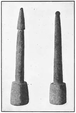 6. Bartlett, usually an admirable observer, failed to notice that the war club was a popular Pima weapon. He says: "The only weapon used by these tribes is the bow and arrow. The short club of the Yumas and the long lance of the Apaches I never saw among them." (Personal Narrative, II, 237.) The clubs were made of mesquite root or of ironwood, weighed about 2 pounds, and in general appearance resembled the old style potato mashers of New England kitchens. (Fig. 9.) The handle was brought to a sharp point, which was almost as effective as a dagger in a back-handed blow. The club was carried thrust point downward through the belt. One club was obtained from its owner and another found in a cache of personal property that had been made in the hills at the death of the owner. The former is 42 cm. long, the head 10 cm. long and 9 cm. in diameter; the point is 9 cm. long. A club in the National Museum, (no. 27846) that was collected some years ago at Sacaton is 0.385 m. long, 7 cm. in diameter. Doctor Palmer secured three in 1885 and believed that none remained among the Pimas. These clubs, now in the Museum, are of the following lengths: no. 76023, 48 cm.; 76024, 44 cm.; and 76025, 46 cm.