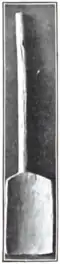 Hoe. Another implement of early adoption by the Pimas combined the functions of spade and hoe. It was used to loosen the soil around plants and to cut away weeds. It was made of ironwood and was thin, hard, and heavy. As it was quite short and curved but slightly it could be used only when the workman was in a kneeling or sitting position. It was sharpened along the convex curve at the wider end. The entire implement was so thin that it must have chafed the hands. But one specimen was found on the reservation (fig. 10, c).[10]