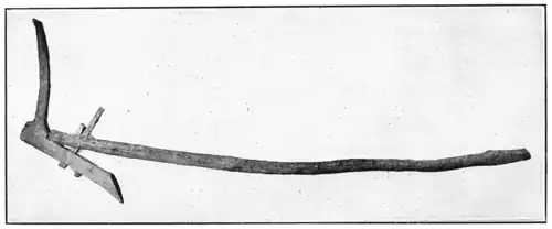 Plow. Of comparatively modern introduction, the wooden plow is of but passing interest in our present researches. It is a survival of European culture that effectively influenced the Pimas for but one generation, or from 1850 to 1880, when the influx of Americans created a demand for wheat which the Pimas were able to supply in part as they could not have done without this implement. By the end of that period they received steel plows. The wooden plow was made of mesquite or ironwood with a cottonwood tongue that extended to the ox yoke. The rear end of the tongue was beveled underneath to an edge which engaged with a transverse notch in the handle. The bottom dragged at a considerable angle, so that the point alone came in contact with the soil. The cutting face was usually supplied with an iron or steel covering resembling the single-shovel cultivator of the Americans. The bottom and single handle were of one piece, the latter being a branch that set at a convenient angle, about 70 degrees, with the trunk of the tree from which the bottom of the plow was cut (fig. 11).[12] The tongue was held in place by a mesquite pin passing through the bottom and a slot in the butt of the tongue and tightened by two wedges which were adjusted by means of a mesquite mallet carried for the purpose.[13]
