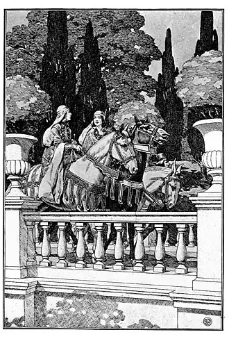 There was upon the outskirts of the city a great building that had once been the Palace of Justice, but was no longer used because a loftier one had been erected in the square where the minster rose. This stood not far from the river-bank, and was all of gray stone that had crumbled somewhat, so that the tracery of leaf and flower in the Gothic windows and the faces and claws of the gargoyles that peered from roof and corner were in many places worn away. It was built on three sides of a great court, where now grass and vine and flower grew unchecked, on the spot once worn by the feet of gathering citizens and the tramp of steeds. Bluebird and swallow and wren had entered through the broken windows, and had built about the window niches and in the crannies of the carven vine. This, said the King, should be the place of learning consecrated to the maidens, for it was not meet that they should gather in the market square or on the hill beyond the minster, as young men did in those days when thousands came together to listen to philosophical disputes, and no roof was sufficient to cover them. Workmen came and mended broken arch and column, and cleared away the tangled vines of the court, but left growing grass and flower, and did not touch the nesting birds, for the seven lovely sisters begged that they might stay. Hither flocked innumerable damsels, who came riding from all parts of the kingdom, with squires before them and waiting-maids behind. They came on black jennet and white palfrey and pony of dapple gray; maiden madness had run throughout the kingdom, and all who could sit on saddle or hold rein rushed hither for their share of the new learning. Many were pursued by father or brother, by maiden aunt or widowed mother,
