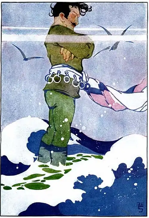 But Tonto, with the chest upon his back, hurried off to the deep woods and buried the chest under an oak tree, then, standing beside the oak tree, pretending to be its cousin, he thought and thought and thought how he could marry the Princess. For ten whole days and nights he thought and, at the end of the tenth night, he had come to the conclusion that he could only marry her by ceasing to be a giant. For nineteen days more he pondered upon this puzzling question, but on the night of the nineteenth day he strode quickly over the hills and dales until he had come down to the sea. He waded in, and when the water rose higher than his head he began swimming with all his might. On and on he plowed, faster than the fastest steamboat in the world till he came to the very centre of the sea.