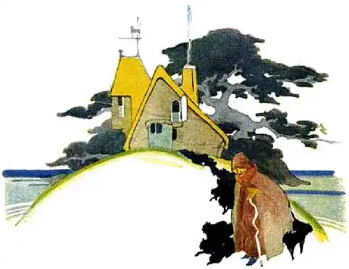 Then the old witch began shaking her head from side to side and pulling her hat down over her nose, which is the way all witches think, I am told. Finally she called shrilly, "It can be done, it can be done!! But what will you give me," and coming down to the water's edge she fixed her red eyes greedily on the last giant. "Anything—anything at all," whispered Tonto, for fear of blowing her away again. "A lock of your hair," screamed the witch, "a lock of your hair," and hobbling into the hut she returned with a pair of witch's shears.