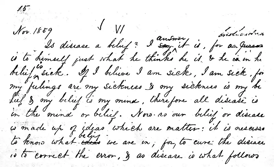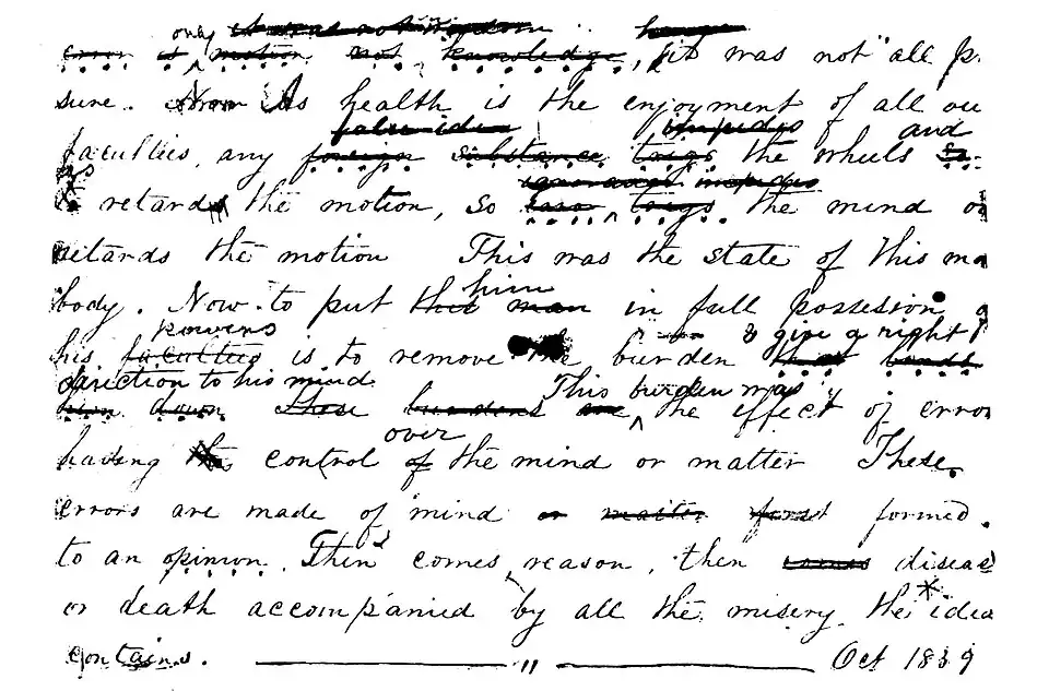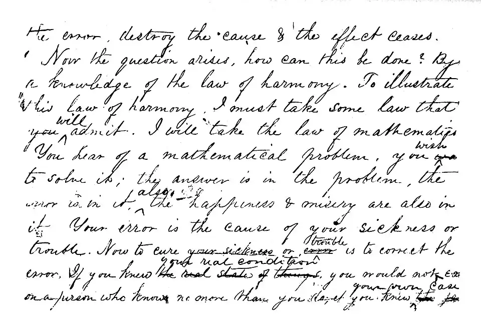 II-IX. These eight pages contain facsimiles of four pages from one of the copy-books into which the articles constituting “Volume I” were copied after the Misses Ware had consulted Dr. Quimby concerning revisions and changes. The articles from which these facsimiles are taken are printed in full. (See Chapter XIV.) The dates show the time when the articles were first written and copied. The changes made in the text in the handwriting of Miss Emma Ware, were made at a later time, probably in 1865, with a view to revising these articles for publication in a volume of Dr. Quimby's writings. Similar emendations for the sake of clearness were made in several volumes of the copy-books prior to Dr. Quimby's death. These changes indicate the kind of revision approved of by Dr. Quimby.