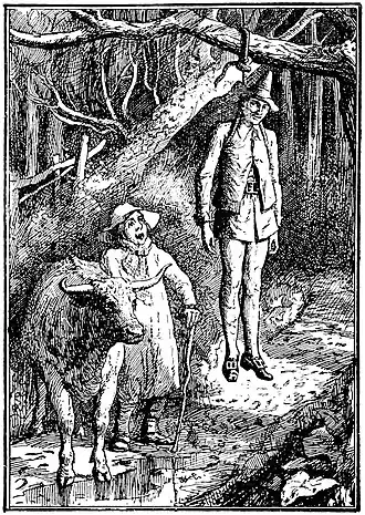 This time he took with him a rope and put it under his arms and tied himself up to a tree, which hung over the road that the man would have to take. So the man came with his ox, and when he saw the body hanging there he felt a little queer.