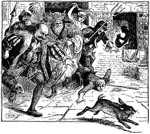 Very soon afterwards, however, the youth let slip the third hare, and it set off and ran round and round the courtyard. The people in the kitchen saw this too, and believed that it was still the same hare that was running about, so they wanted to go out and catch it.