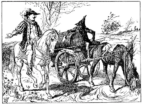 When the Master Thief got there the mare went along so slowly and quietly that the cart hardly seemed to move from the spot. The mare pulled it a little forward, and then a little back, and then it stopped quite short. Then the mare pulled a little forward again, and it moved with such difficulty that the Governor had not the least idea that this was the Master Thief. He rode straight up to him, and asked if he had seen anyone hiding anywhere about in a wood that was close by.