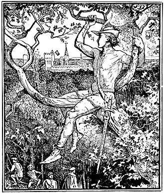 They found a very high oak tree, and there they sat, turn about, keeping their eyes always fixed on the castle tower. On the twelfth day, when the turn came to Benjamin, he noticed a flag waving in the air, but alas! it was not white, but blood red, the sign which told them they must all die. When the brothers heard this they were very angry, and said: