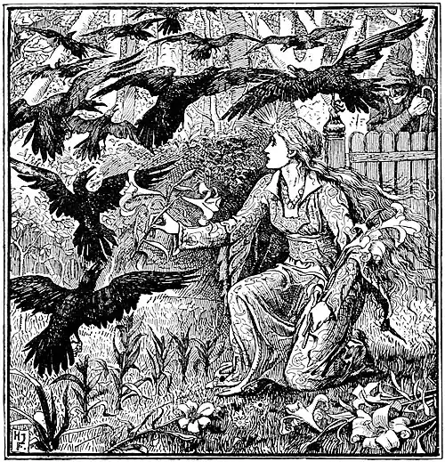 flames were licking her garments with their red tongues, the very last moment of the seven years had come. Then a sudden rushing sound. was heard in the air, and twelve ravens were seen flying overhead. They swooped downwards, and as soon as they touched the ground they turned into her twelve brothers, and she knew that she had freed them.