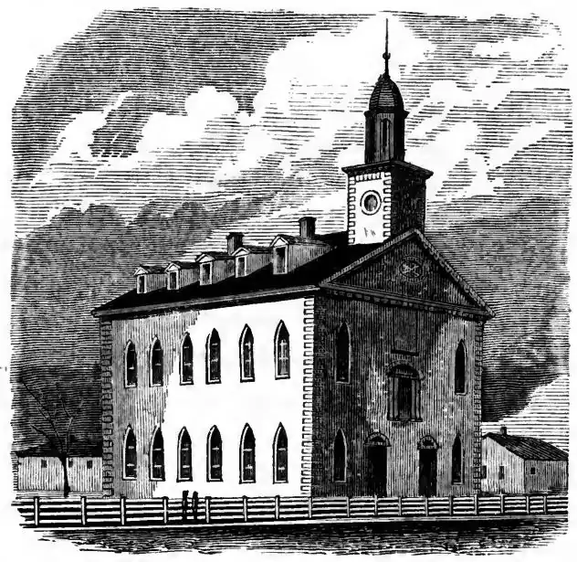 "Outside dimensions sixty feet in width and eighty feet in length; its height from the ground to the top of the eaves, about fifty feet; from the basement forty-four, giving two stories of twenty-two feet each, besides an attic story in the roof for school rooms. It was lighted by thirty gothic, three Venetian, two dormer, one circular, and two square gable windows. The dome of the steeple was one hundred and ten feet high, and the bell about ninety feet from the ground."