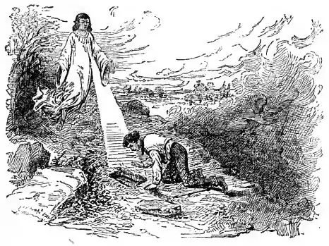 Twice more during the night the messenger appeared in the same manner, and rehearsed the same things, adding at the third visit a caution to the effect that Satan, on account of father Smith's indigent circumstances, would tempt the son to get the plates for mercenary purposes, but that no other object than the glory of God was to be entertained in obtaining them, and that if he were influenced by any other motive than a desire to build up the kingdom, they could not be obtained at all. These interviews would appear to have continued through the whole night, and at daybreak Joseph arose and went to his labour, but was so exhausted and unwell that his father insisted on his returning home. In essaying to do so, he attempted to cross a fence, but his strength failed him; he fell helpless to the ground, and for a time was perfectly unconscious. The first thing which he recollected was hearing his name called, when he looked up and beheld the same messenger standing over his head, surrounded by light as before. All that had been related during the night was again told him, with the instruction to tell his father of the vision and the commandments that he had received. He returned and did so, and his father replied that it was of God, and bade him go and do as directed by the messenger. Joseph immediately repaired to the locality where he had been told the plates were deposited, and from the distinctness of the night's vision, he at once recognized their place of concealment.